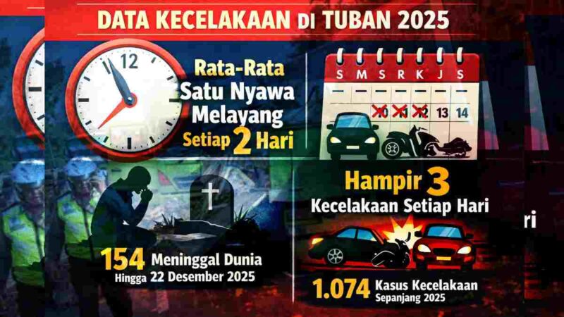 Tuban – Di balik penurunan jumlah kecelakaan lalu lintas sepanjang tahun 2025, jalan raya di Kabupaten Tuban masih menyisakan fakta kelam. Berdasarkan data Satlantas Polres Tuban, angka korban meninggal dunia akibat kecelakaan menunjukkan bahwa rata-rata satu orang kehilangan nyawa setiap dua hari sekali.